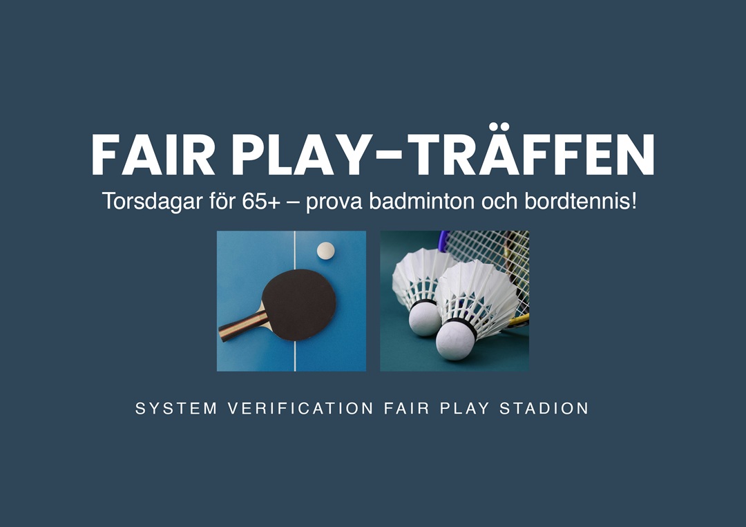 Vill du röra på dig, träffa nya vänner och ha roligt? Fair Play Sport Club bjuder in dig som är 65+ till kostnadsfritt spel i badminton och bordtennis på torsdagar kl. 13.00-15.00 på System Verification Fair Play Staadion. Inga förkunskaper behövs – alla kan vara med! Ingen föranmälan behövs. Det är bara att dyka upp.